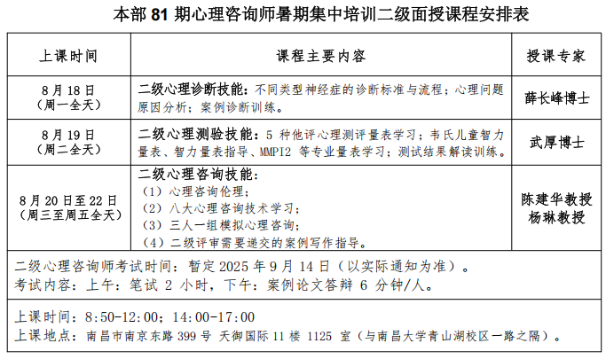 本部 81 期心理咨询师暑期集中培训二级面授课程安排表