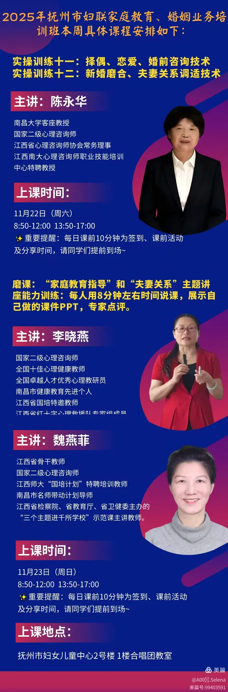 自2025年10月25日开班,历时近一个月的周末集中培训,抚州市妇联家庭教育、婚姻业务培训班于11月22日至23日完成最后一周课程,圆满落下帷幕。