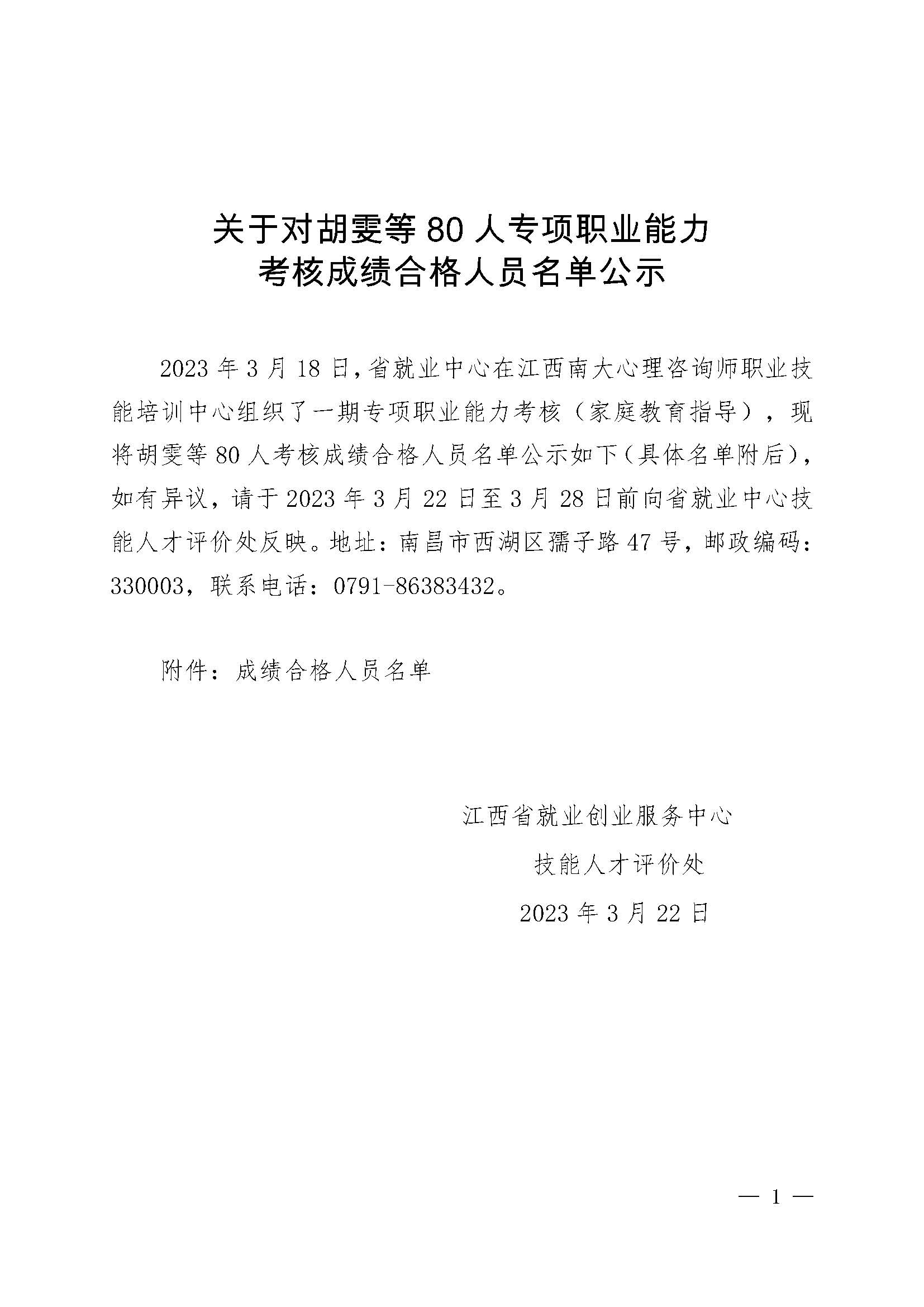 关于对胡雯等80人专项职业能力考核成绩合格人员名单公示