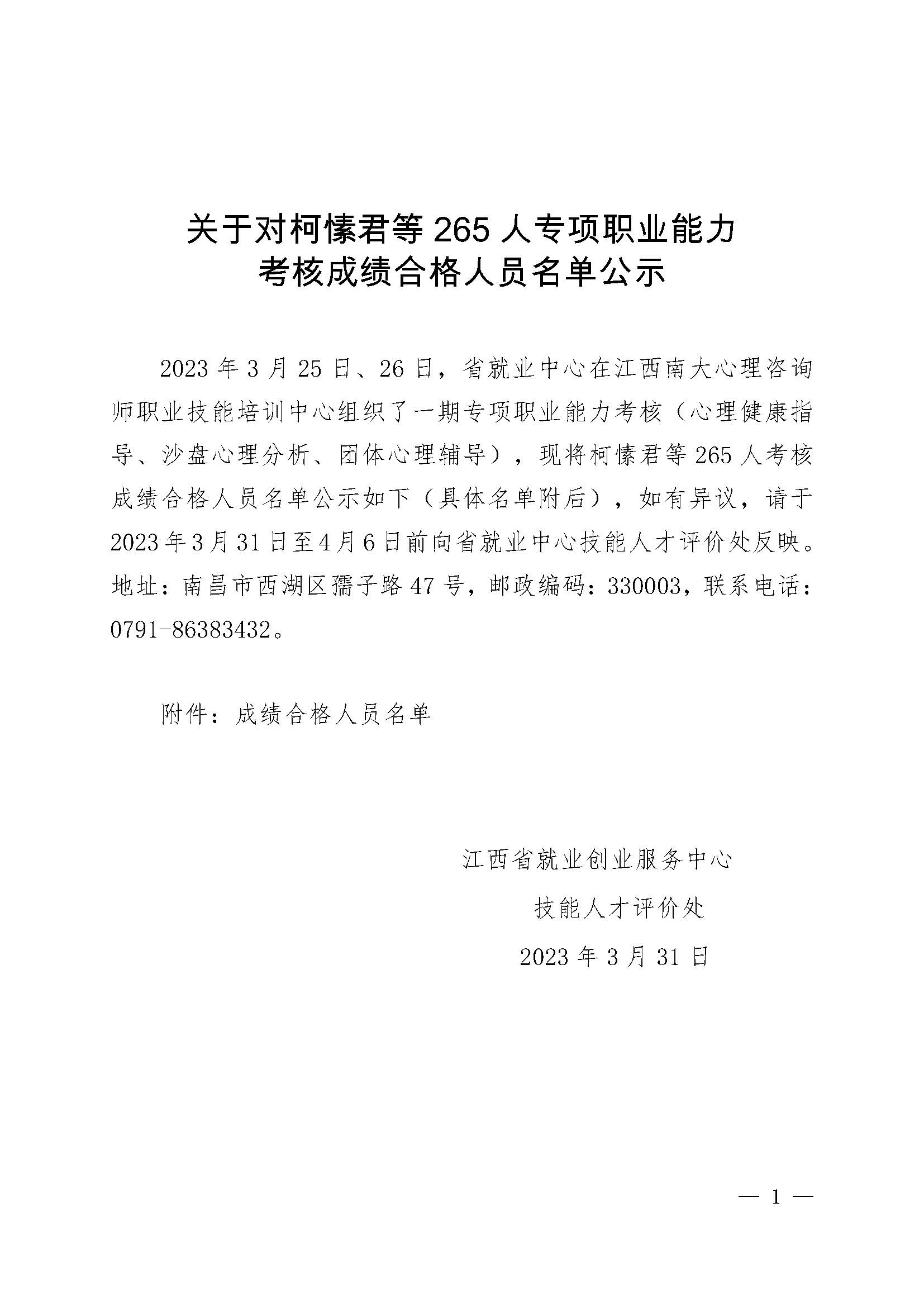 关于对柯愫君等265人专项职业能力考核成绩合格人员名单公示