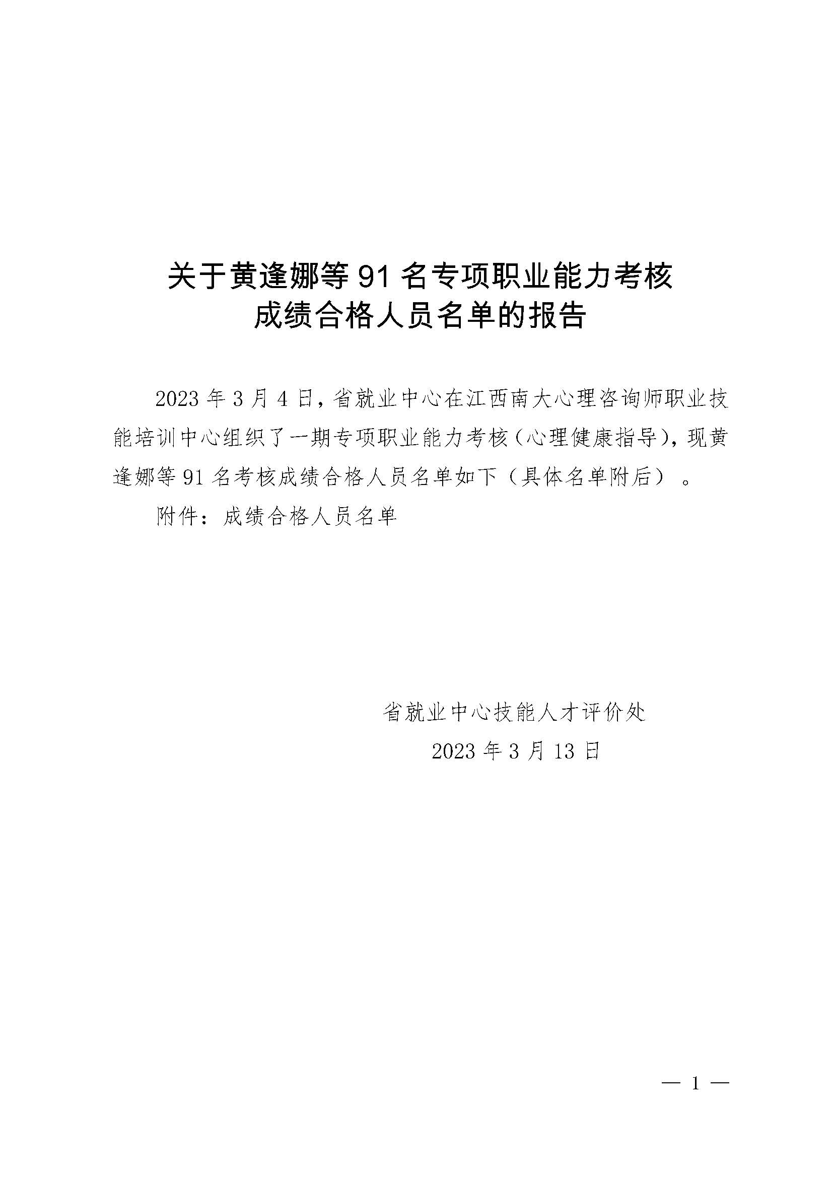 关于黄逢娜等91名专项职业能力考核成绩合格人员名单的报告