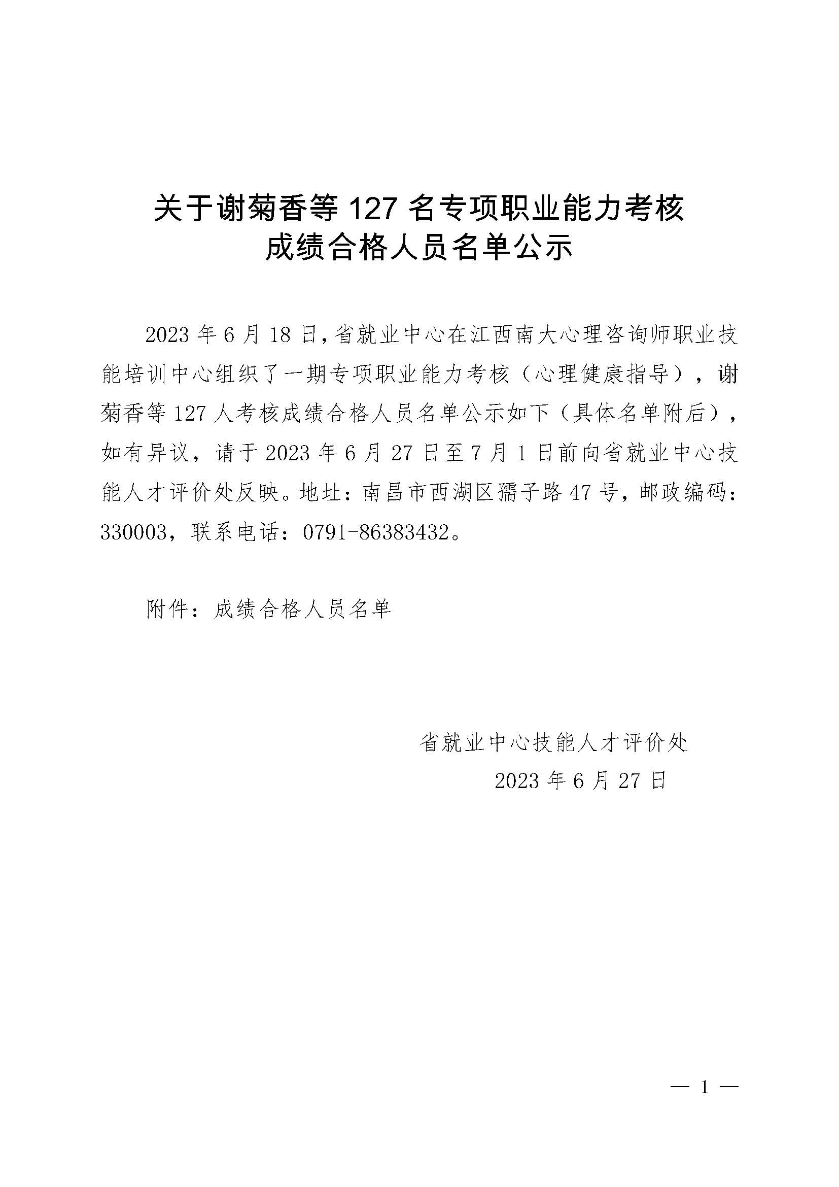 关于谢菊香等127名专项职业能力考核成绩合格人员名单公示
