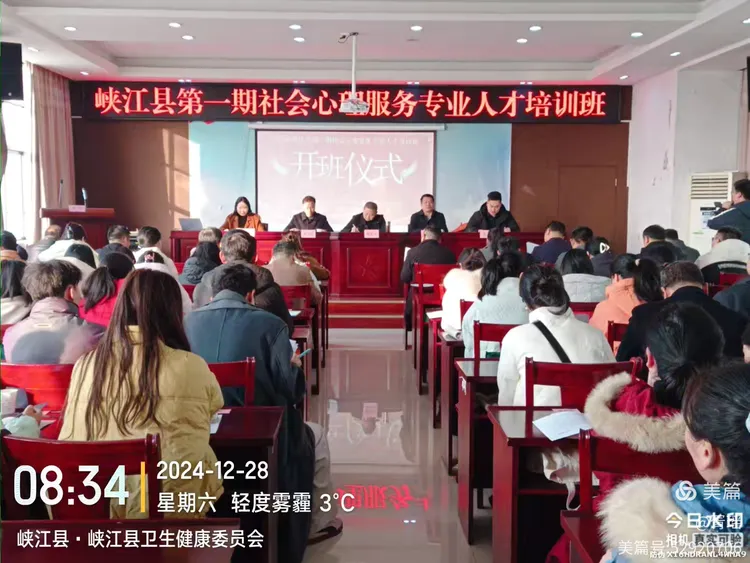 2024年12月28日,峡江县平安峡江建设领导小组社会心理服务专项组与峡江县社会心理服务协会主办的社会心理服务专业人才培训班开班。开班仪式在县卫生健康委员会五楼会议室举行,来自政法系统、卫健系统、教育系统及各乡(镇)从事信访维稳、矛盾纠纷排查化解、心理健康辅导的工作人员和社会心理服务志愿者共63人参加了此次培训。县委常委、政法委书记龙足立、县卫健委主任李文清、资深心理学教授郭春明、南大心理咨询师职业技能培训中心主任朱铭、以及峡江县社会心理服务负责人席丽辉出席了开班仪式。